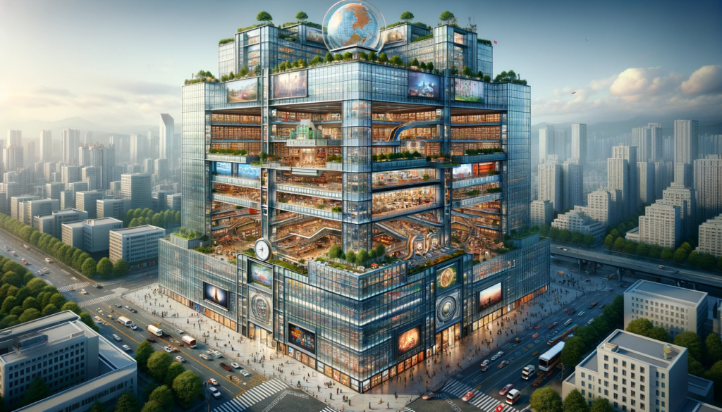The building, a colossal block measuring 100 meters in length and width, was a global center for linguistic and cultural exchange. The ground floor, accessible from the lively streets, was a hub of retail activity, buzzing with stores that attracted a myriad of shoppers.
