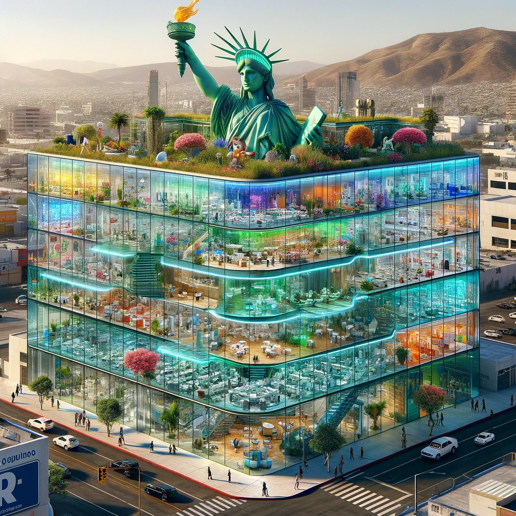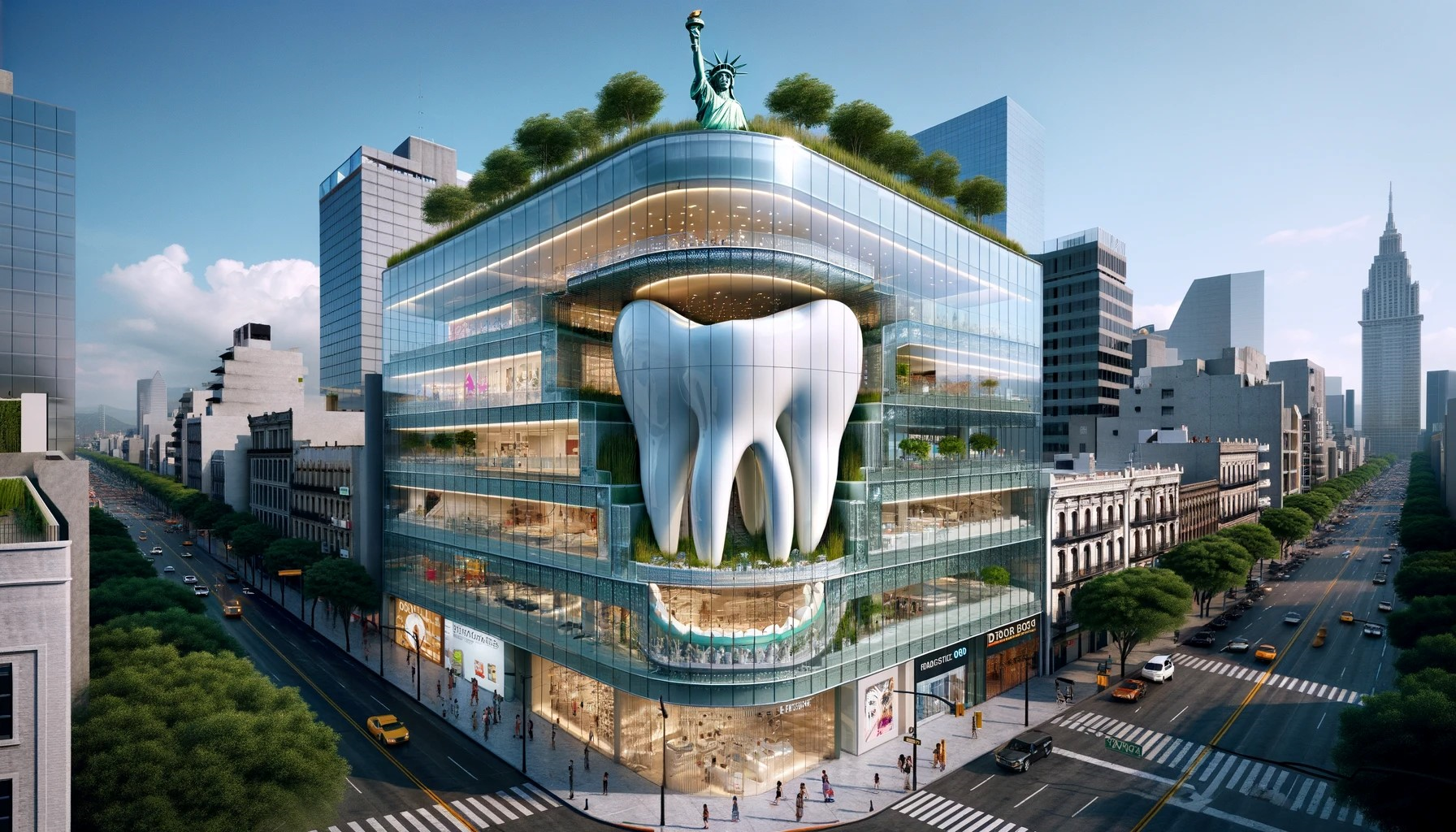 Please, as a creative writer, write a story positively with a precise description about the construction, usages, and benefits of a modern glass building on one whole block 100 meters long and 100 meters wide as a Mexican dental center, first fooler all stores in the busy street and the first 14 floors for lower teeth field with dental related wholesalers, colleges, and university to supply, educate and train dentists, and at the middle to set of smiling teeth, and the second 14 floors for upper teeth, all dentist office with four seasons garden on the roof plus the tall statue of Liberty at the very top.ChatGPT