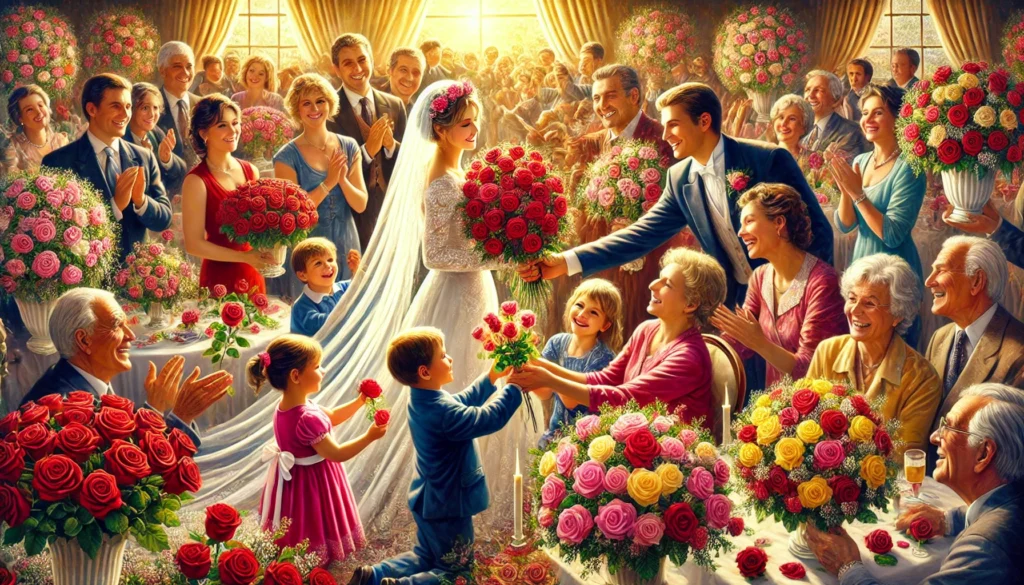 Here’s an image portraying joyful moments with people celebrating different occasions where roses take center stage. Each event is depicted warmly to highlight love, gratitude, and happiness.