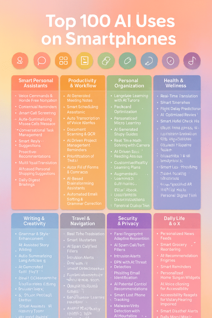 AI on smartphones has evolved significantly by 2025, with built-in features like Apple Intelligence on iOS, Google Gemini on Android, Samsung Galaxy, and others. AI provides seamless integration. These, combined with third-party apps, enhance productivity by automating tasks, improving personal organization through structured data and reminders, and enhancing user experience by personalizing interactions and simplifying complex processes. Below, categorized are 100 practical ways to leverage AI on your smartphone, drawing from current capabilities. These are prioritized for benefit, focusing on time-saving, efficiency, and ease-of-use. Many tasks can be completed using voice assistants (e.g., Siri, Gemini, Bixby), camera apps, or dedicated AI apps like ChatGPT or Grammarly.