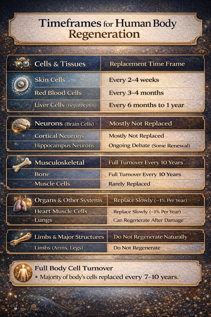 Great question! The human body is constantly renewing itself, but not all parts regenerate at the same rate — and some don’t regenerate at all. Here’s a breakdown by body part or system, highlighting the typical time frame for natural replacement or regeneration: