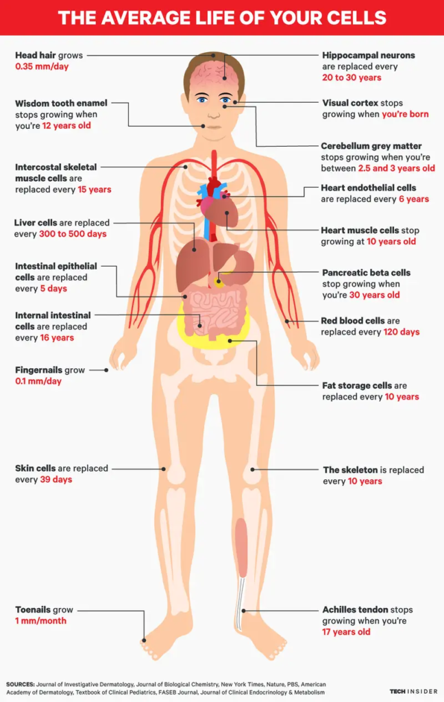 It is a common myth that the human body completely replaces itself every seven years. In reality, the body is a mosaic of “new” and “old” parts. While some cells are replaced in mere days, others—like those in your brain and eyes—stay with you from birth to 100-plus years lifelong.