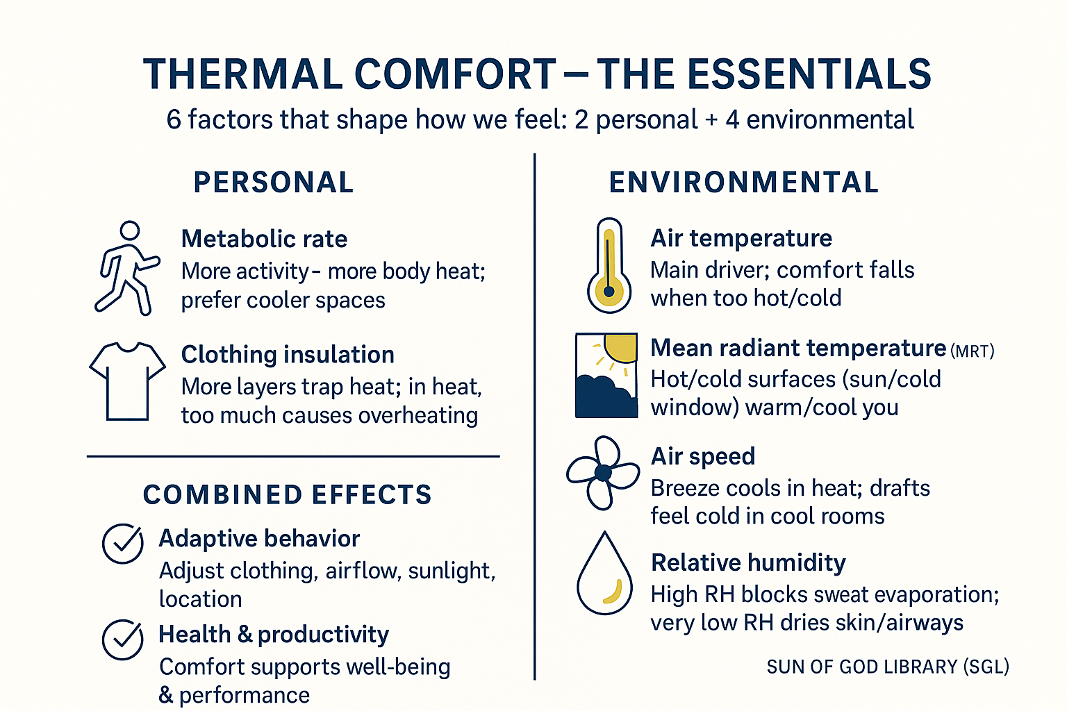 - Adaptive behavior: Individuals often adjust personal factors in response to changing environmental factors. For example, a person may open a window (changing air speed), adjust their clothing (changing insulation), or move into or out of sunlight (changing radiant temperature) to feel more comfortable.