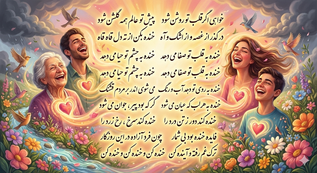 شعر «خنده» با زبانی شیرین و امیدبخش، بر شادیِ دل و دوری از اندوه تأکید میکند و از این نظر، میتواند با موضوع «طول عمر و نوسازی سلولی» که پیشتر دربارهاش گفتگو کردیم نیز پیوند داشته باشد. از نگاه علمی، خنده با کاهش سطح کورتیزول (هورمون استرس) میتواند به تقویت عملکرد سیستم ایمنی کمک کند و زمینه را برای ترمیم و نوسازی بهتر بافتها و تولید سلولهای تازه فراهم سازد.