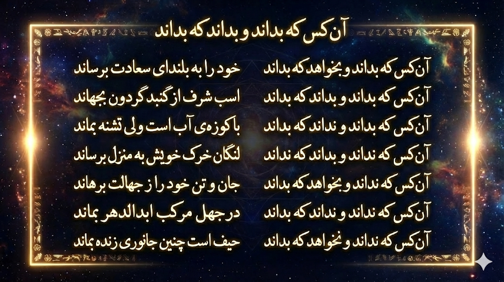 این شعر در دستهبندیهای مختلفی (جاهل، جاهل مرکب، عالم، عالم جاهل، دانا، نادان و غیره) سروده شده و به انواع انسانها از نظر دانش اشاره دارد و مهمترین نکته آن، «آنکس که نداند و بداند که نداند» است که با تلاش، به علم میرسد، برخلاف جاهل مرکب که نادانی خود را نمیداند و در جهل میماند.